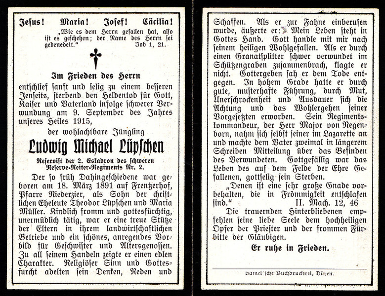 "Den Reiter Lüpschen (2. Esk.) trafen am 22.08.1915 Minensplitter bei Souain; nach zwei Wochen erlag er seiner Verwundung, ebenfalls im Lazarett Kaisertreu."